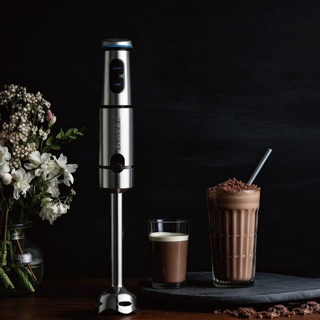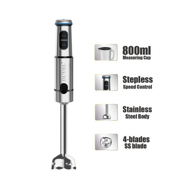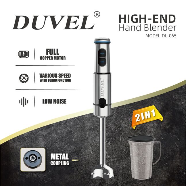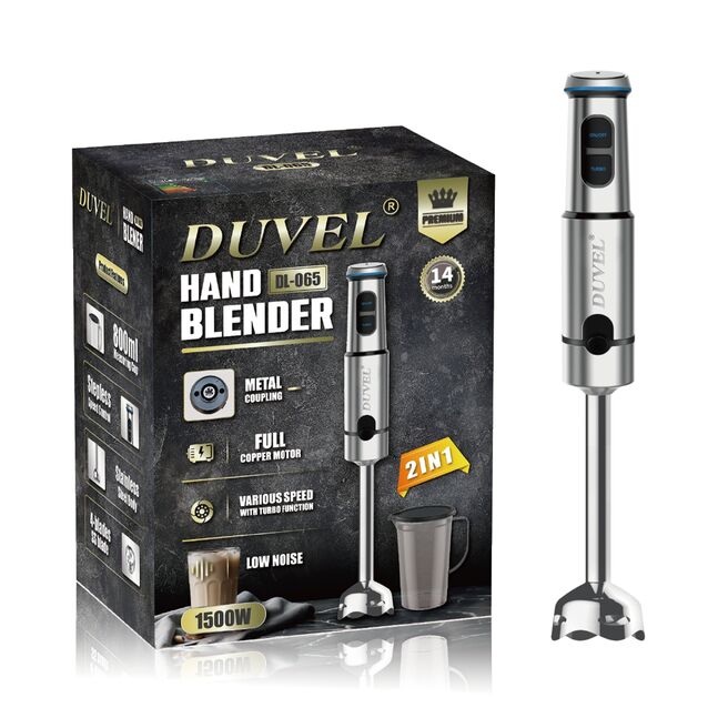 DUVEL-Hand Blender 2-IN1 *Stable,Quite,Powerful DCmotor *Stepless speed control *Turbo function *Metal joint *Four-blades blade *Detachable design for easy cleaning and storage *600ML measuring cup/whisk *AC220-240V, 50/60Hz, 1500W *QTY:12pcs *G.weight:14.3kg *Carton size:0.49*0.45*0.37